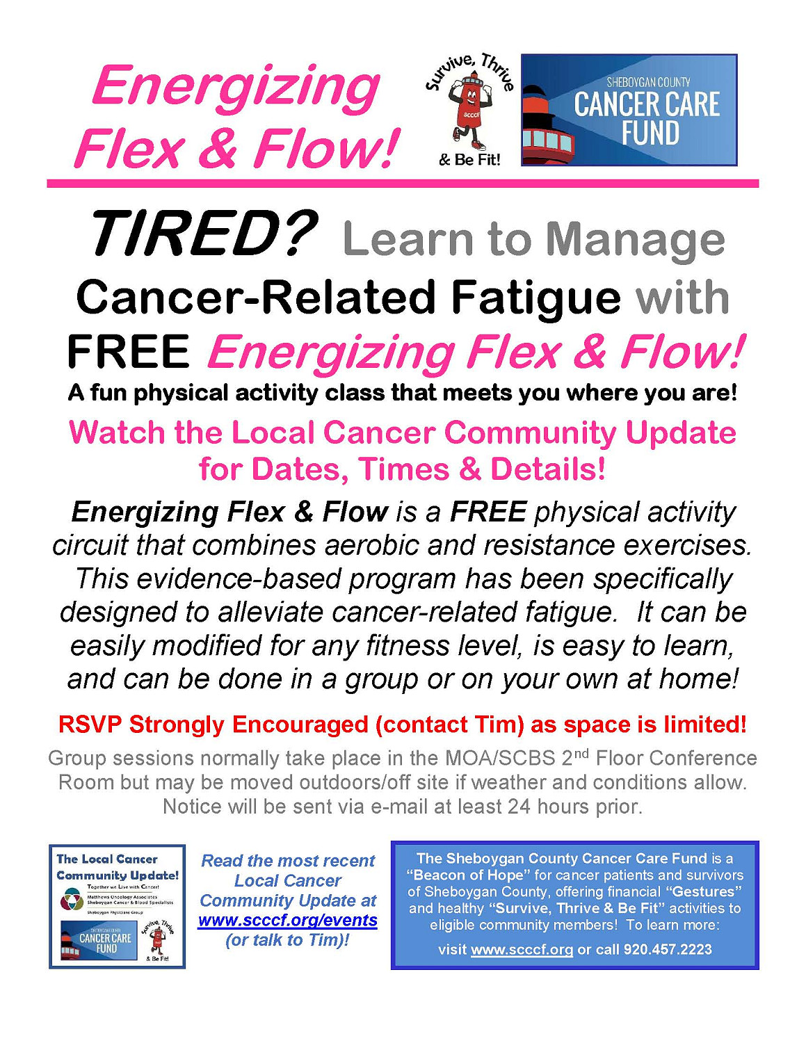 Check out the current issue of the Local Cancer Community Update for dates/times of Energizing Flex & Flow classes at SCBS or contact Tim for more info!