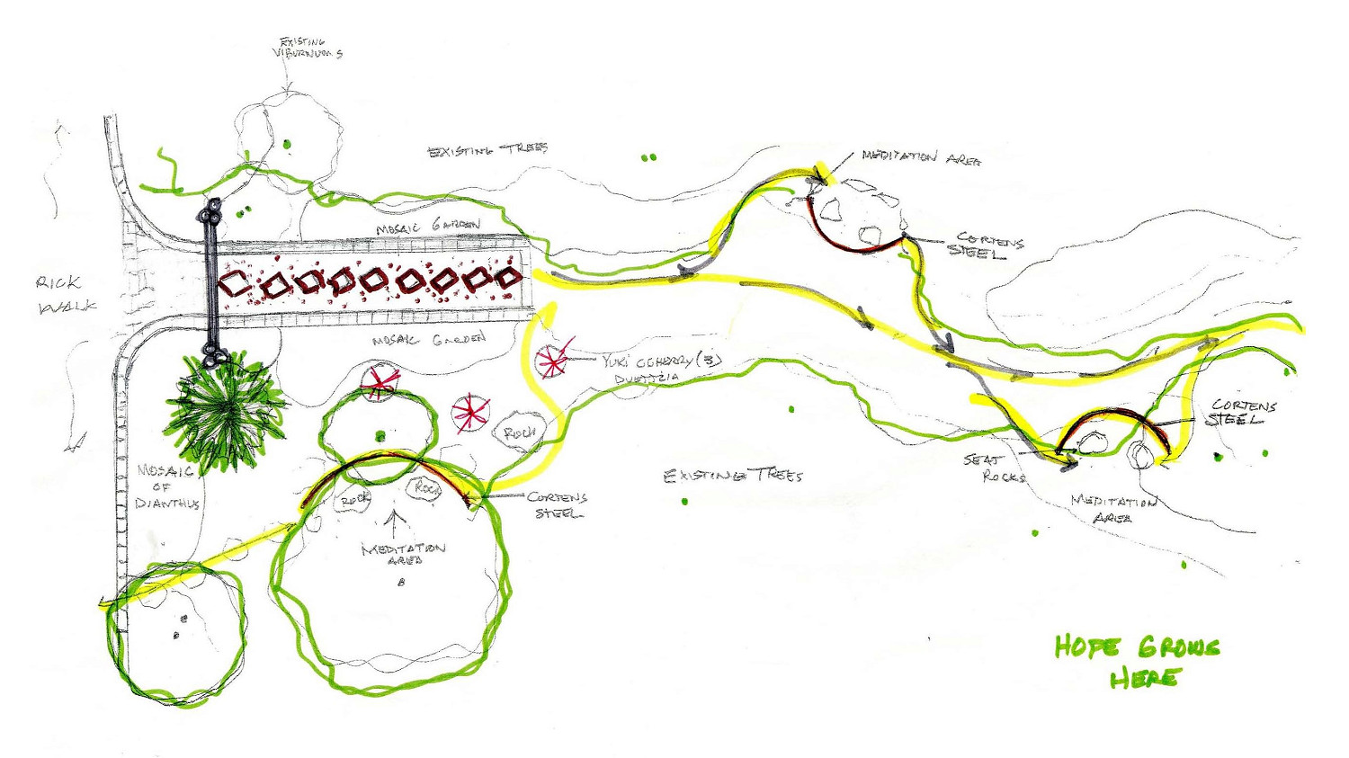 Work has begun on a “Secret Garden” that will offer opportunities for visitors to rest, reflect, remember at several meditation pockets located in sliver of a garden on the ridge of a hill!